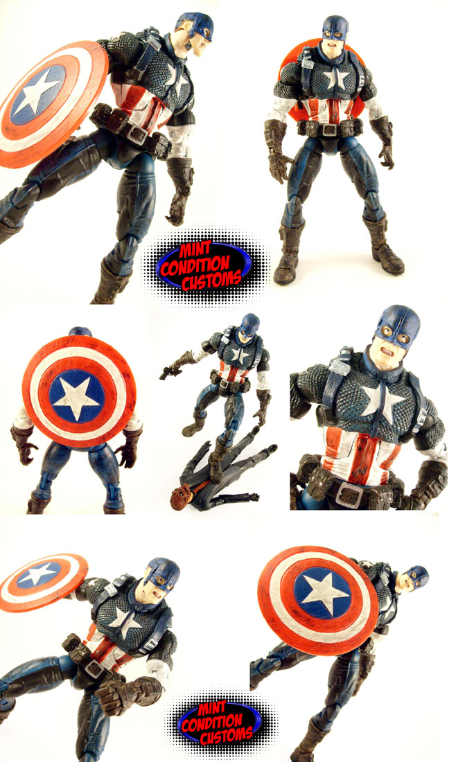 Movie Concept Captain America - Created August 29, 2008This one was a lot of fun to do, and just hit me in the past couple of days. I had bought the Ultimate Nick Fury/Captain America 2-Pack that Hasbro put out and I noticed something...the head on the Captain America figure was good. Like, really good. Good enough to pass as a movie head...at least by Hasbro's standards. And I always imagined a movie version of Cap's suit to have a helmet as opposed to a cowl. So it was perfect. So I just filled it with apoxie and dremmeled out a hole to fit on the Ultimate Cap's neck, painted the head a dark blue, and I painted the neck flesh tone and used part of a Sinister cape strap for a collar. I also used a very thin strip of a cape strap for a seam down the middle, or more of a zipper look. Because I imagine Cap's suit to be more of a biker jacket style like Daredevil's. I also cut up the straps that came with the Captain America figure, and added them to the shoulders to make the suit look more complex like it probably would in a movie. Next, I basically just toned down all the colors on Cap's suit. I imagine they wouldn't be so vibrant in a movie. So I darkened the red stripes on his torso, even dry-brushed some grey on the white parts, dry-brushed some black on his chest armor and on all the other blue on his suit, and painted over the grey parts with black. I also dry-brushed black on his gloves and boots. I wanted it to look very gritty. With his shield, I put scratches on it with a hobby knife, and just darkened the colors like I did on his suit, dry-brushed some black to make it look used and gritty and there you go. How I would imagine Captain America looking in a movie...and I know I didn't add the "A" on his forehead. I doubt he would have it in a movie. |