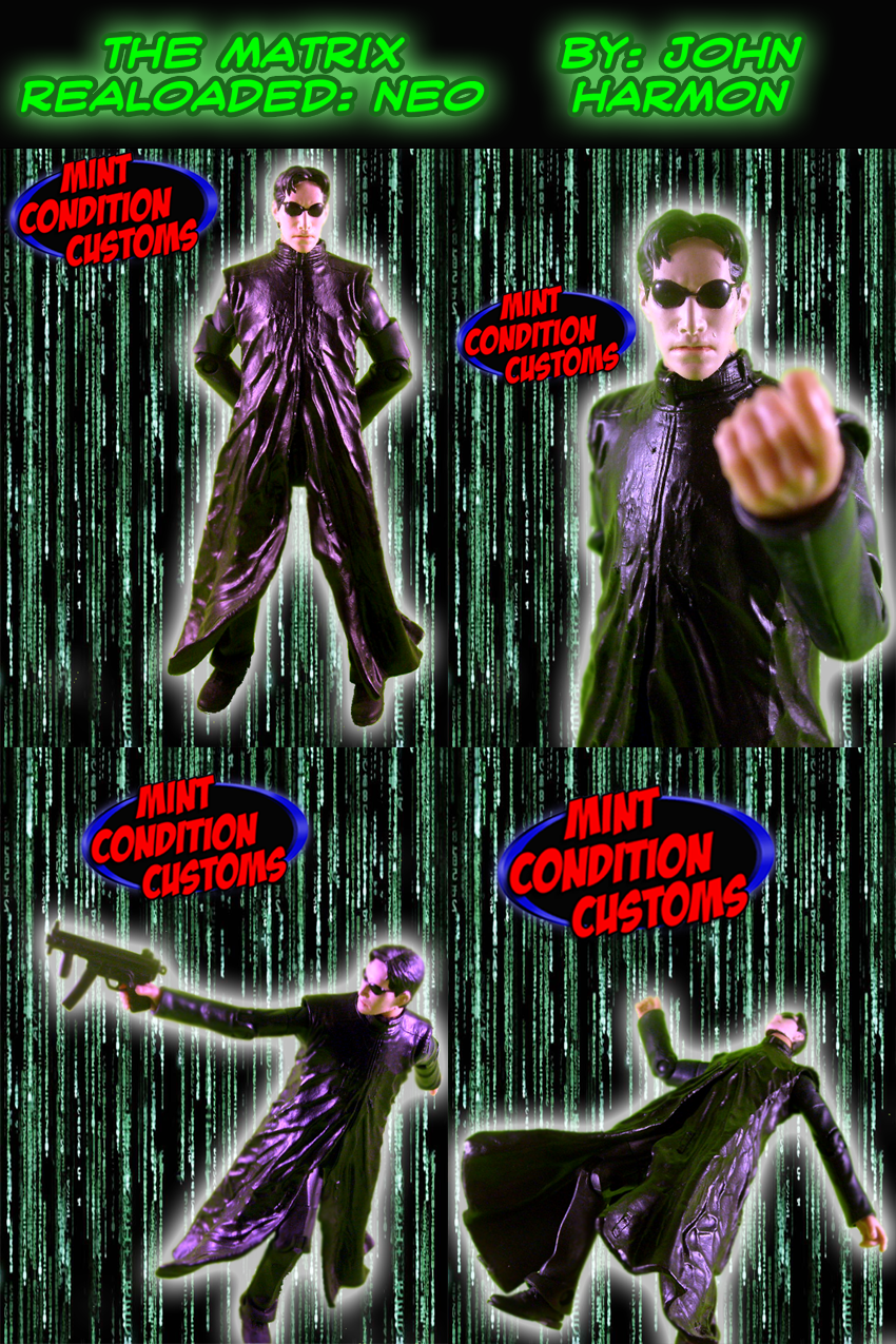 The Matrix Reloaded: NeoIn celebration of The tenth anniversary of the release of the first Matrix film, I decided to make a few Matrix customs. Next off is a custom Matrix Reloaded Neo. Neo was made using the Body of a Movie Masters Scarecrow figure, the arms from a Joker Thug, and the head from a Neo figure from the original Matrix toy line. I took the Scarecrow body, cracked it open, and switched out the arms with a Joker Thug. Then I apoxied over the seams (for a better "weld"), and painted the shirt black. Then I painted the Scarecrow's jacket completely black, inside and out and slipped it over the body. Then I painted the shoes black, and started working on the head. I had to dremmel down the neck to fit on the Scarecrow's body, then painted a thin line of tan flesh tone between his lips to help separate them visually. The gun he's holding came with the original Neo figure. All paints used were Testors, and the green tint on the photos was added for a "Matrix" effect. |